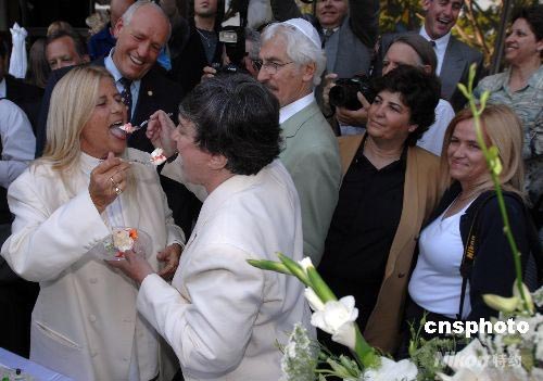 当地时间六月十六日下午五时零一分,美国加州贝弗利山的女同性恋者罗宾·泰勒和戴安·奥尔森(左),在洛杉矶县政府大楼门前登记结婚。这是上个月加州高等法院裁决同性恋婚姻合法化后的洛杉矶县第一对同性恋结婚者。当地媒体蜂拥而至,其中有三家电视台同时进行现场直播。中新社发 张炜 摄