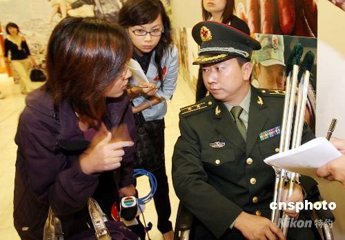 “大爱无疆—汶川大地震抗震救灾图片展”在香港展览中心展出,大会邀请到抗震救灾第一线的英雄成都军区的钟良军在开幕式上作报告。中新社发 洪少葵 摄