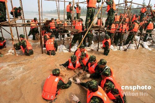 6月18日,山东省军区和济南警备区在济南西郊玉清湖附近黄河大堤举行大型防汛抢险演练。来自济南市的10支民兵预备役部队、黄河专业抢险队等共1300余名队员演练了水情侦察、封堵决口、爆破分洪、管涌抢护、堤坝抢护、紧急营救、抢筑子堤等七项防汛抢险科目。中新社发 周青先 摄