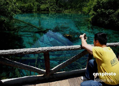 6月18日,一位香港心理教育志愿者完成灾区服务任务后,路过震后九寨沟,拍摄分外宁静的美景。四川汶川大地震丝毫未损四百公里外的九寨沟,风景区旅游设施完善如初,六月底前将部分恢复旅行社组团旅游,游客主要通过航空和甘肃省以及四川省的绕行公路进出。地震以来,这里每天都接待一些散客。中新社发 贾国荣 摄