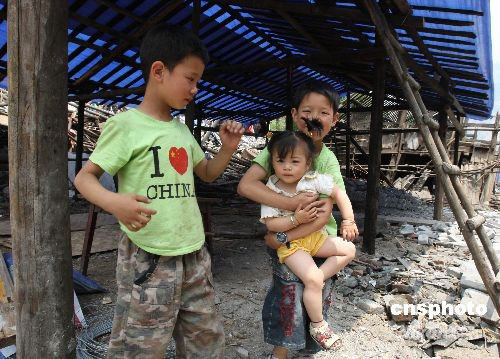 6月19日,一对双胞胎男孩与其小妹妹在被震毁的家中。四川汶川映秀镇渔子溪乡在“5.12”汶川大地震中损毁严重,一个多月来幸存下来的双胞胎男孩与其小妹妹始终难舍震毁的家园,每天都从简易帐篷回到这里玩耍。中新社发 贾国荣 摄