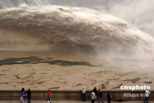 6月19日上午9时,黄河小浪底水库开始实施调水调沙,这是自2002年以来黄河小浪底的第七次调水调沙。此次调水调沙,预计历时12天左右,最大流量达到每秒3900立方米左右。调水调沙期间,小浪底、西霞院库区全面封航。中新社发 平白 摄