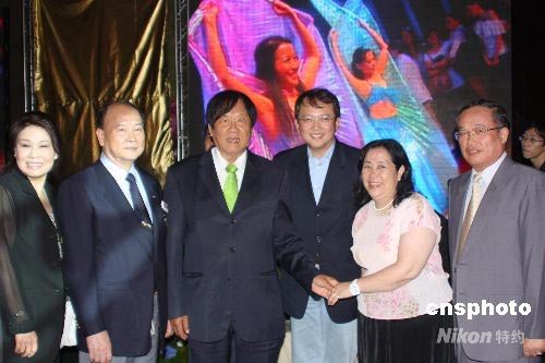 台湾“立委”周守训(右三)前来向《明报》企业集团董事主席张晓卿(左三)表示祝贺。中新社发 耿军 摄