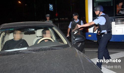 六月十九日夜,北京丰台警方举行奥运安保演练,进行设卡拦截演习。五十余辆警车迅速到达进出北京方向和相关环线的各个路口执行拦截任务,并成功将“犯罪嫌疑人”截获。中新社发 杨阳 摄