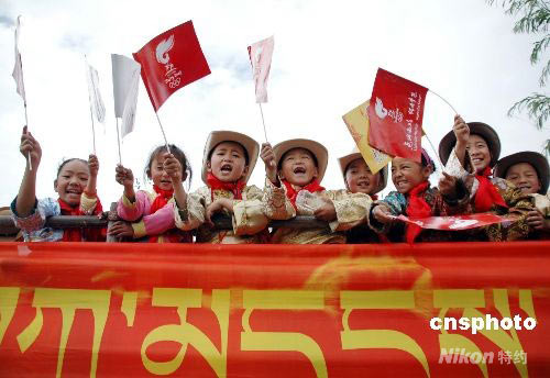拉萨市的藏族小朋友们穿上节日盛装,在街头欢庆奥运火炬来到雪域高原。中新社发 周波 摄