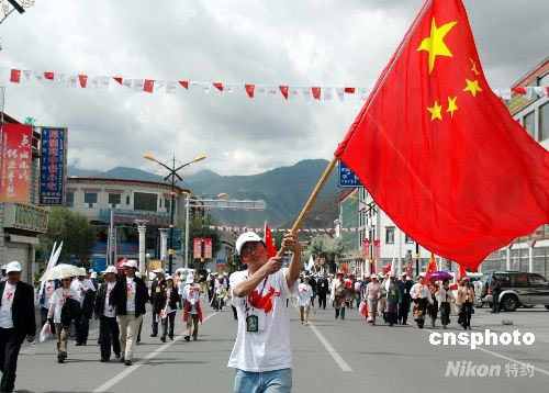 图:拉萨市民挥舞国旗涌上街头喜迎奥运火炬