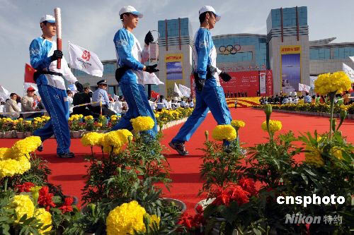 6月22日,北京奥运火炬开始在青海省格尔木市的传递,今早九时,火炬接力起跑仪式在格尔木市盐湖广场进行,圣火护卫手捧圣火火种步入仪式现场。中新社发 廖攀 摄