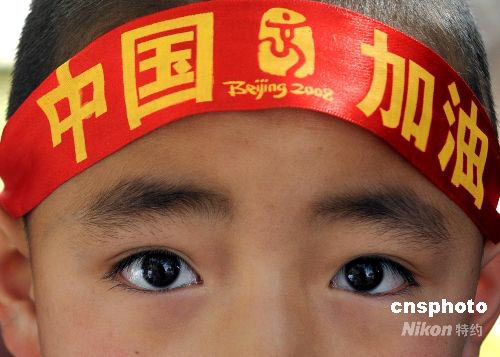 6月22日,奥运圣火在青海格尔木传递。一名目光清纯的孩子在路边为火炬传递加油。