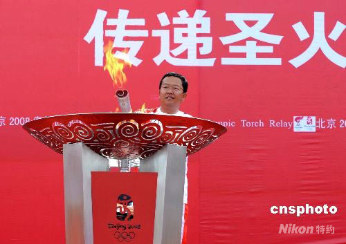 6月22日10时42分,末棒火炬手——“全国十大杰出青年”李小松在格尔木中心广场点燃圣火盆,北京奥运火炬接力格尔木站传递活动圆满结束。中新社发 廖攀 摄