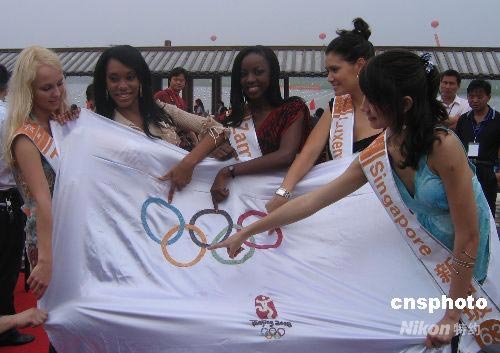 6月23日,参加一年一度世界休闲小姐总决赛的佳丽们来到苏州中国珍珠宝石城举行巡游活动。在珍珠湖畔,佳丽们亲手穿线串珠,共同制作了由20888颗淡水珍珠汇成的奥运五环旗,并奉上“预祝2008北京奥运会举办成功”的美好祝愿。 中新社发 黄莹 摄