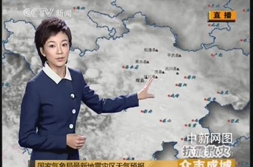 王蓝一在《众志成城 抗震救灾》直播中播报天气预报。