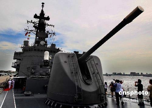 日本舰艇“涟”号到达湛江军港后,中日记者应邀到“涟”号上参观采访。中新社发 宋吉河 摄