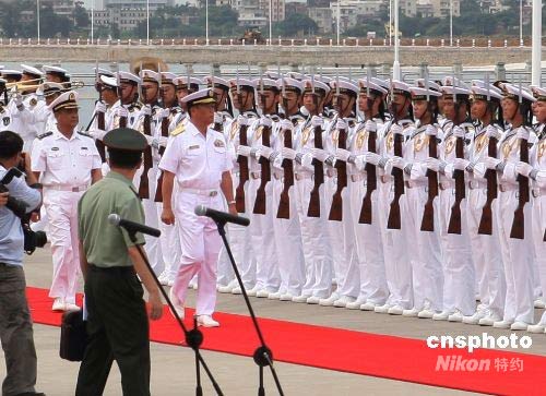 图为日本海上自卫队第四护卫队群司令德丸伸一少将,在中国人民解放军南海舰队司令苏士亮陪同下检阅中国人民解放军海军仪仗队。中新社发 宋吉河 摄