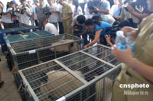 6月24日下午,4只来自四川卧龙的受灾大熊猫抵达福州熊猫世界。这也是“5·12”汶川大地震发生后,除运往北京的8只“奥运熊猫”外,卧龙正式向外省转移安置的首批大熊猫。中新社发 郑祚声 摄