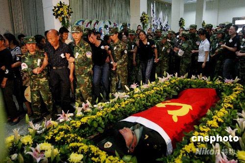 6月24日,被济南军区某集团军评为革命烈士并被追记一等功的济南军区某红军师士官武文斌烈士的遗体在四川都江堰市殡仪馆火化。上午9时在都江堰市殡仪馆举行了隆重的向武文斌烈士遗体告别仪式,武文斌生前所在部队的官兵和社会各界的近万人参加了向遗体告别仪式。中新社发 曾宪平 摄