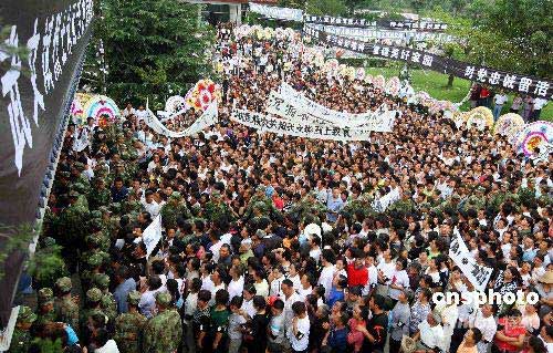 图为烈士武文斌生前所在部队的官兵和社会各界人士近万人参加遗体告别仪式,送别抗震救灾英雄。中新社发 曾宪平 摄