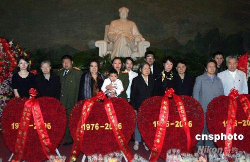 资料图为2006年9月9日毛泽东逝世三十周年纪念日,毛泽东的亲属汇聚位于北京天安门广场的“毛主席纪念堂”敬献鲜花。刘思齐(左二,毛泽东长子毛岸英之妻)、毛新宇(左三,毛泽东之孙)、邵华(左四,毛泽东之子毛岸青妻子)、毛东东(左五,毛泽东重孙)、刘滨(左六,毛泽东孙媳妇)、李敏(左八,毛泽东女儿)、孔继宁(左九,毛泽东外孙)、孔东梅(左十,毛泽东外孙女)、李讷(右三,毛泽东女儿)、王孝芝(右二,毛泽东外孙)、王景清(右一,毛泽东女婿)等献花后,在毛泽东塑像前合影。中新社发 任晨鸣 摄