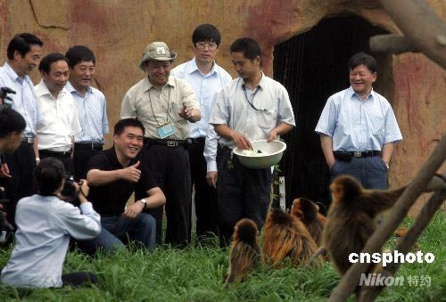 6月25日上午,台北市长郝龙斌一行到上海野生动物园,看望大熊猫和金丝猴。郝龙斌希望上海的大熊猫和金丝猴能落户台北,此外台北的红毛猩猩、白毛长臂猿能来到上海。并题词:关心生态爱护野生动物是进步城市的重要指标。中新社发 潘索菲 摄
