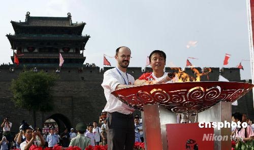 6月15日下午16时35分,随着山西平遥最后一棒奥运火炬手与外国友人一同在平遥古城迎薰门广场点燃圣火盆,北京奥运火炬在平遥的传递顺利落下帷幕。 中新社发 张云 摄