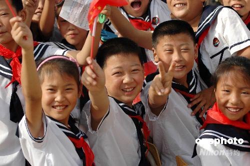 6月25日,海军援建四川绵竹市天河小学移交仪式在这里隆重举行,孩子们挥舞着国旗,热烈欢呼庆祝新校园的移交。这个活动板房学校由海军出资400多万元援建,新校园占地4778平方米,建有30间大教室、10个教师办公室和2个多功能房,在海军陆战队官兵的全程帮助支援下,学校仅用短短6天时间就建成。中新社发 李唐 摄