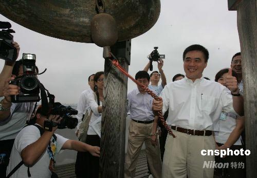 6月26日,台北市市长郝龙斌在沪考察正在建造中的上海世博会参展场址、了解世博会筹备情形,并撞钟祝福上海世博会成功。中新社发 潘索菲 摄
