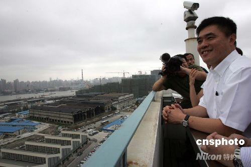6月26日,台北市市长郝龙斌在沪考察正在建造中的上海世博会参展场址、了解世博会筹备情形,并俯瞰建造中的上海世博会全景。中新社发 潘索菲 摄