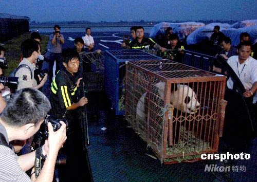六月二十六日,原居住在卧龙自然保护区的5只大熊猫乘飞机到达广州白云国际机场,并将被转移到广州市香江野生动物世界。香江野生动物世界在已有5只大熊猫的基础上,将同时拥有10只大熊猫,成为全国拥有大熊猫最多的野生动物园。中新社发 刘卫勇 摄