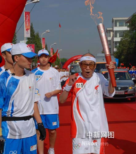 现年九十一岁的李智老先生是年龄最大的一位火炬手,他曾两次与自行车队友从大同出发到北京声援奥运,倡导全民健身。张雷杰摄