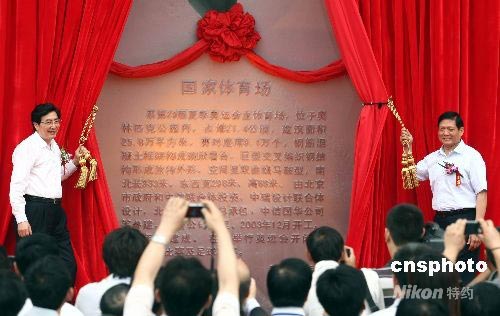 6月28日,2008年北京奥运会主体育场(“鸟巢”)落成典礼在北京举行,北京市委书记、北京奥组委主席刘淇与北京市委副书记、市长、北京奥组委执行主席郭金龙等参加落成典礼仪式。图为刘淇、郭金龙为国家体育场落成纪念柱揭幕。中新社发 盛佳鹏 摄