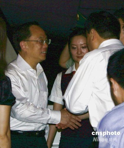 6月27日晚9点55分,香港特首曾荫权一行乘坐CA428航班抵达成都双流国际机场,28日将与澳门特首何厚铧一起前往彭州和都江堰看望灾民及考察灾后重建情况。中新社发 黄永莉 摄