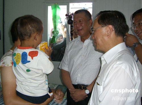 6月28日上午,香港特别行政区行政长官曾荫权、澳门特别行政区行政长官何厚铧一行来到彭州市小渔洞镇江桥村大楠社区安置点,慰问当地受灾群众,了解抗震救灾情况。中新社发 郭嘉农 摄