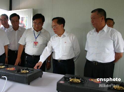 香港特首曾荫权、澳门特首何厚铧一行在四川省副省长魏宏陪同下,抵达地震重灾区彭州市小渔洞镇大楠社区安置点,慰问当地受灾群众,参观安置房、公共厨房和安置点内的娱乐设施,并体验了公共厕所。中新社发 霍潺 摄