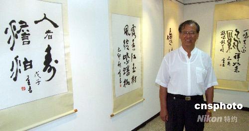 6月29日,台湾澎湖本地书法家蓝重吉的书法展揭幕,为迎接7月4日的大陆旅游首发团,届时大陆旅游团将携带八十多幅作品加入此次展出,两地书画同好将齐聚一堂,交换心得。中新社发 CNA 摄