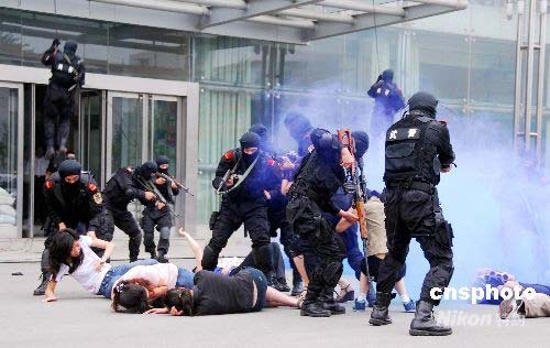 6月30日,山东省反恐怖工作协调小组在济南成功举行了“泰山2008”反恐演习。“泰山2008”反恐演习以北京奥运会期间可能发生的恐怖袭击事件为背景,以有效防范和正确处置为课题,主要目的是检验和提升山东省城市防范处置恐怖袭击事件的应急反应能力、组织指挥能力和综合保障能力。这次演习是山东省第一次公安各警种与武警、卫生、市政等反恐应急力量协同作战的合成演习,是第一次以导调推演方式进行的检验性演习,也是第一次通过全省公安视音频系统同步传输的反恐演习。中新社发 陈 进 摄