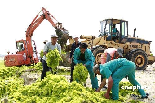 青岛近海浒苔大量聚集 数万人清理逾10万吨(图)