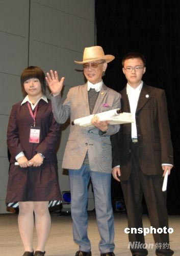 八十九岁高龄的日本漫画家协会理事长柳濑 嵩向来自南山中学的学生代表勾梁丁、苏思宇同学表达深切的问候,并接受了两位同学的礼物--南山中学的画册。中新社发 朱沿华 摄