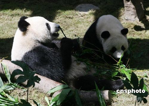 乐乐、盈盈在香港海洋公园享受美味的竹子。中新社发 武仲林 摄