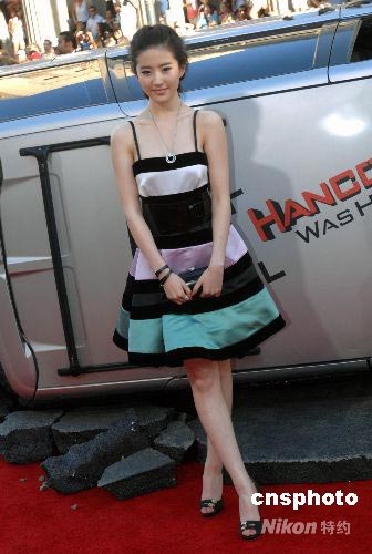 当地时间六月三十日晚,索尼电影公司出品的喜剧动作片《全民超人》(Hancock)在好莱坞中国剧场举行盛大首映式,明星红地毯走秀规模堪比奥斯卡颁奖礼。图为华人女影星刘亦菲出席首映式。中新社发 张炜 摄