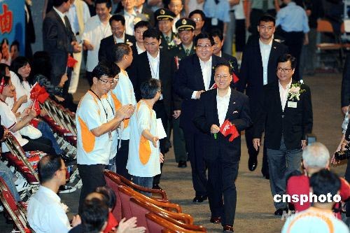 七月一日,香港回归祖国十一周年纪念日,香港各界庆典委员会在香港体育馆举行盛大综合文艺汇演,表达对汶川大地震灾后重建、庆祝香港回归及北京奥运的支持。特区行政长官曾荫权、中联办主任高祀仁等嘉宾出席,并与现场数万观众共同欢庆。中新社发 洪少葵 摄