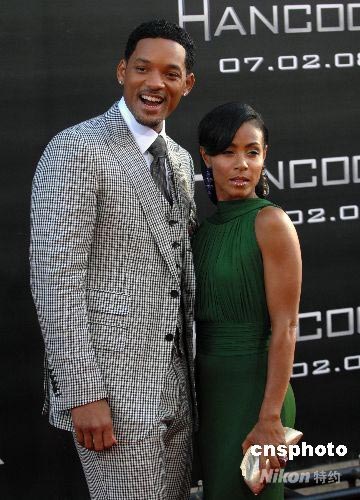 图为《全民超人》男主角汉考克的扮演者好莱坞著名影星威尔·史密斯(Will Smith)与妻子贾达·萍克·史密斯一起出席首映礼。中新社发 张炜 摄