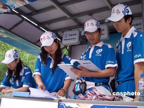 7月1日,来自北京一所高校的志愿者们正式进入海淀区某街道的志愿者服务站,开始上岗服务。经过封闭培训、考核通过的城市志愿者,将在历时百天的的服务日中,向参加北京奥运会、残奥会的运动员、工作人员、观众、记者、游客以及北京市民提供信息咨询、应急服务、语言翻译等多项热情周到的服务。中新社发 冯军(北京) 摄