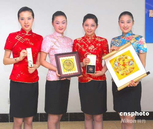 南京首航两岸周末包机“神秘小礼物”揭晓,包括南京特有石头雨花石所做成的摆设品、手链和钥匙扣以及“工艺之宝”云锦。“身价不菲”的南京云锦卷轴挂画可能会馈赠给头等舱旅客。中新社发 王浩 摄