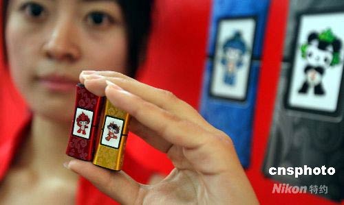 七月二日,北京2008年奥运特许商品奥运吉祥物电子纪念章、联想火炬闪存盘等正式推向市场。特别是联想奥运吉祥物闪存盘由于价格适中、实用性强,一上市就受到消费者的喜爱。 中新社发 任海霞 摄