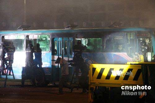 图为重庆市刑警总队官兵进行公共汽车反劫持演练。中新社发 周阳 摄