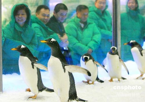2008年7月3日凌晨,6只(3雌3雄)年龄分别为6至8岁的南极白眉企鹅从大连圣亚极地世界首次出远门,乘坐飞机抵达苏州市高新区白马涧生态园,应邀参加以“极地科普、呼吁环保”为主题的“2008苏州白马涧冰雪狂欢饮料节”助游展演活动。该活动自7月5日起在该市举行为期两周。中新社发 苏秀 摄