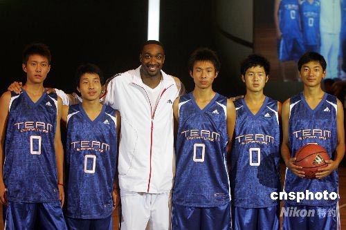 7月3日,NBA球星吉尔伯特·阿里纳斯在上海出席阿迪达斯2008夏季篮球联赛全国总决赛开幕式,一支来自汶川的高中篮球队得到了吉尔伯特·阿里纳斯的特别“照顾”,传授球技、合影留念,吉尔伯特·阿里纳斯(左三)和这些小球员来了个“亲密接触”。中新社发 汤彦俊 摄