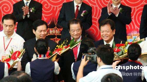 7月4日早晨七点,两岸周末包机南京首航暨大陆居民赴台旅游首发仪式在南京禄口国际机场隆重举行。图为空乘人员向乘客代表等献花。中新社发 丁梅 摄