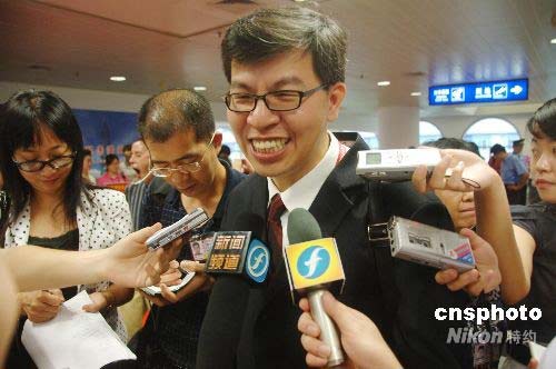 搭乘赴台旅游福建首发团暨周未包机从厦门到松山的台湾中国时报旅行社游学中心总经理赵政岷先生,在厦门高崎机场接受媒体采访时,对两岸交流广阔前景充满信心。中新社发 郑祚声 摄