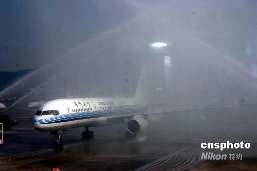 七月四日上午,大陆居民赴台旅游暨两岸周末包机陆续抵达台湾的机场。来自大陆福建省的首发团在松山机场接受喷水洗尘的礼遇。中新社发 徐长安 摄