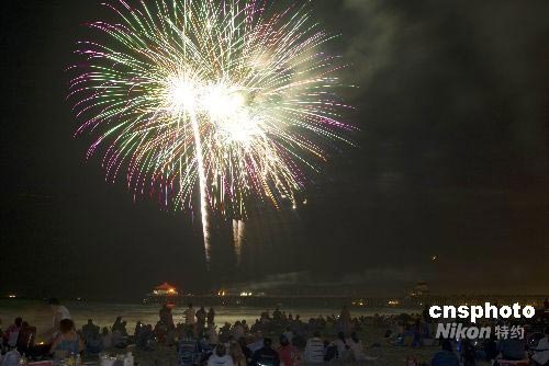 七月四日是美国独立日,当晚,美丽的烟花在美国南加州海滩上空绽放,数以万计的民众在海滩观看烟花表演。据美国烟花协会透露,目前美国百分之九十八的普通烟花来自中国,百分之八十的专业烟花来自中国。独立日燃放烟花已经成为美国的传统民俗。中新社发 张炜 摄